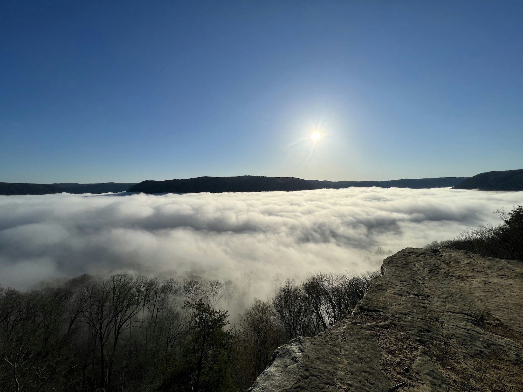 The beginner/intermediate crew will hike about 5 miles to a backcountry site along a stream (there are several to choose from). Along the way we’ll hike through boulders and along mountain streams, and work our way around the side of a mountain. On Sunday we’ll hike about 3.5 miles back to the trailhead. Along the way we’ll stop at an amazing overlook over the Tennessee River (the photo at the top of this page is from a morning when it was all fogged in), and climb up through a rock staircase similar to Stone Door. Despite the shorter distance as compared to some of our advanced treks, this is a great hike with some rewarding challenges and views along the way.